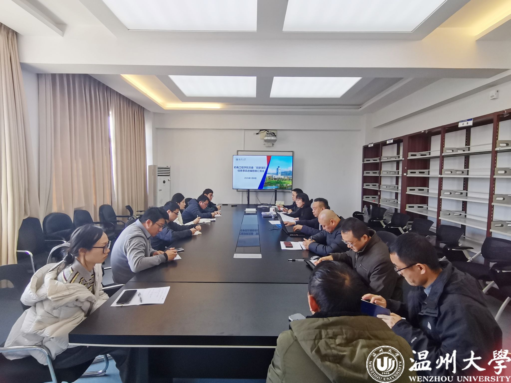 1月8日,温州大学机电工程学院在6C401会议室召开“党建强院”年度验收暨支部书记述职评议会,以“铸魂领雁、强基固本、凝心聚力、创新驱动”四大工程为主线,系统检验全面从严治党成效。各支部围绕四大工程落细落实,交出年度党建“成绩单”。
