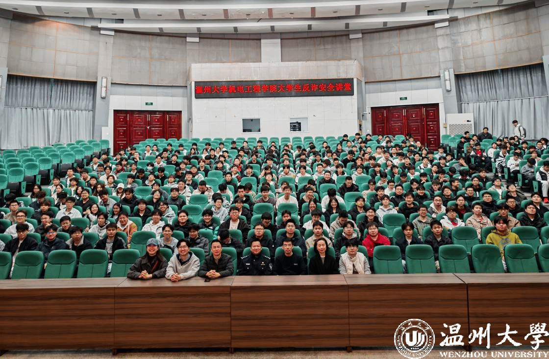 温州市公安局瓯海区分局茶山派出所副所长阮挺,机电工程学院党委副书记方建晓、温州大学保卫科陈琪老师、茶山派出所周警官出席活动,学院全体辅导员、各班安全委员及 2025 级全体本科生、研究生共计500余人参加本次活动。