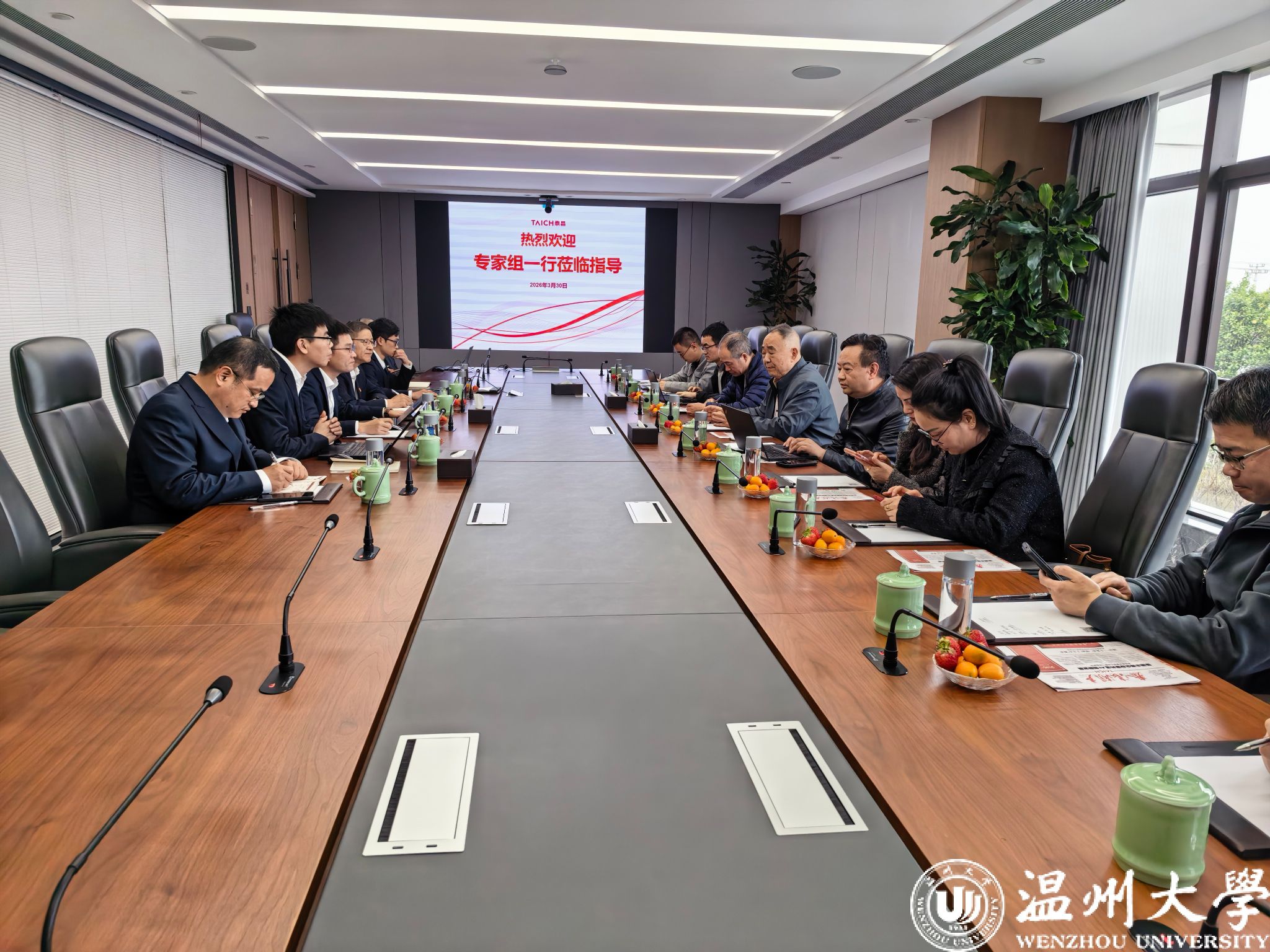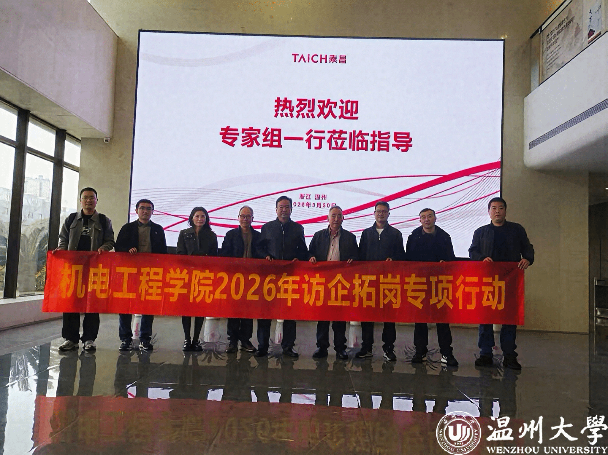 为深入推进产教融合、精准对接企业人才需求,全力拓宽毕业生就业渠道,2026 年3月30日,温州大学机电工程学院院长向家伟率学院相关负责人及教师代表一行,赴温州泰昌集团开展访企拓岗专项行动,双方就人才培养、科研合作、党建共建等事宜进行深度交流。