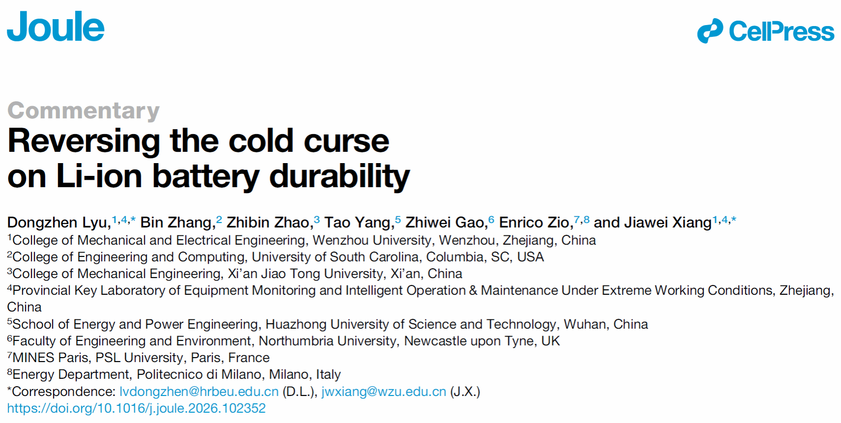 近日,温州大学机电工程学院、全省极端工况装备状态监控与智能运维重点实验室在国际顶级能源期刊《Joule》上发表最新研究成果,题目为“Reversing the cold cure on Li-ion battery durability”。研究团队基于长达两年的真实环境大规模实验,首次提出了“冷利用”(cold-leveraging)这一颠覆性概念,为下一代清洁能源系统的设计提供了全新的思路。