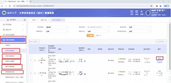 “过程文档管理”->选择“题目所属学院”->“题目所属专业”->查看毕业设计材料(任务书、文献综述、开题报告、教师指导记录和论文初稿)规范性和完成质量。